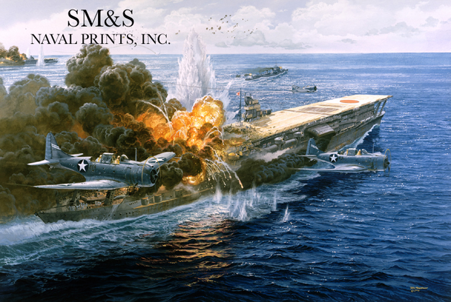 The Imperial Japanese aircraft carrier Akagi is attacked and sunk at the Battle of Midway June 4, 1942. Akagi means "Red Castle" in Japanese.