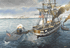 U.S.S. Monitor takes leave of the U.S.S. Minnesota to engage the C.S.S. Virginia, March 9, 1862. Sizes: Overall 19" x 24", Image 14 1/4" x 20 5/8"
