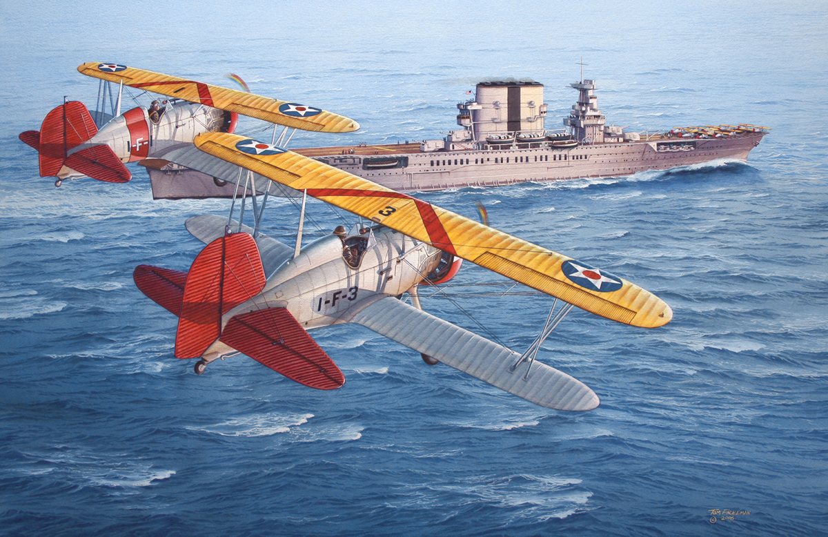 Two Boeing F4B4 fighters manuever into pattern to land on board the U.S.S. Saratoga (CV-3) during fleet problems in 1931.