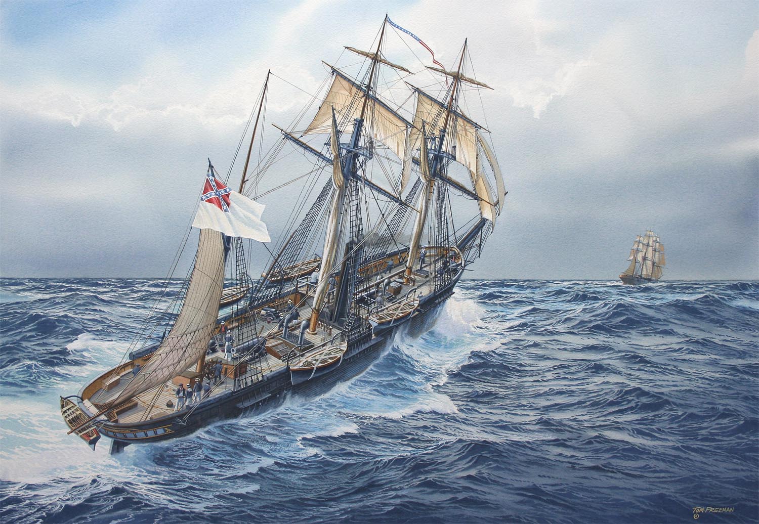 The Confederate Raider C.S.S. Alabama in pursuit of the clipper ship Contest, Nover 1863. Sizes: Overall 24" x 32", Image 19 3/8" x 28"